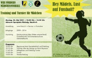 Liebe Girls, liebe Eltern, liebe Trainer, liebe Juniorenobmänner Der Thurgauer Fussballverband organisiert bereits zum sechsten Mal den TKB-GirlsDay. Dieser findet am Samstag, 11. September 2021 in Tobel auf dem Sportplatz Breite . Alle Mädchen der Jahrgänge 2009 bis 2013 sind herzlich eingeladen von 10.00 Uhr bis 11.45 Uhr teilzunehmen. Ob du schon in einem Verein spielst oder nicht, ist nebensächlich. [...]